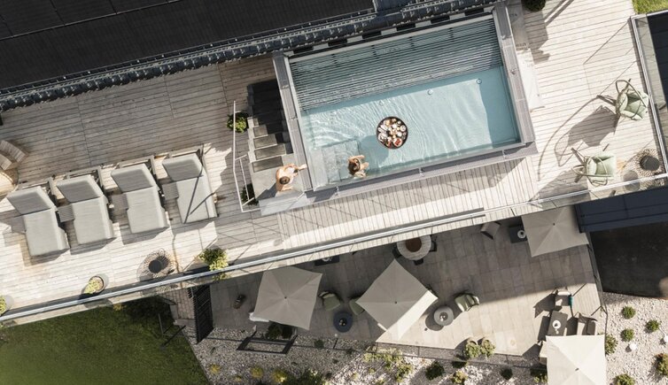 Der neue Wellnessbereich sowie das neue Outdoor-Panorama Whirlpool im 4. Stock mit Blick auf die Dolomiten, ist eines der Highlights des Hotels.