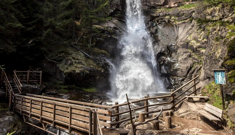 Wir fahren mit dem Taxi ins Nachbardorf Barbian. Dort besichtigen wir die 120 m lange Hängebrücke. Anschließend steigen wir hinauf zum unteren Wasserfall (ca. 85 m Fallhöhe). Beim oberen, kleineren Wasserfall nehmen wir den Weg Nr. 6 in Richtung Bad Dreikirchen. Nach der Mittagsrast im Berggasthof Messnerhof wandern wir durch den Wald bis zur Villanderer Alm Straße. Von dort bringt uns der öffentliche Bus wieder zurück nach Lajen.