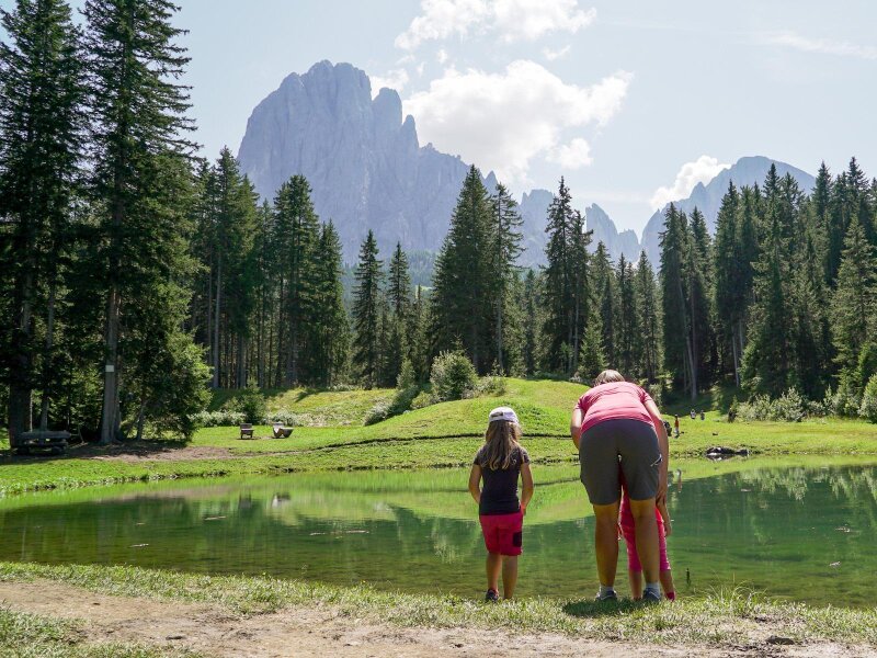 Several adventure stations made of natural materials await you in the Monte Pana recreation area near Santa Cristina Valgardena. The theme trail starts at the photo setup with Mount Sassolungo as background, located at the valley station of the Monte Sëura Chairlift. Plan a minimum of 1.5 hours for the walk, so that you have enough time to play, discover and enjoy the fabolous mountain world of the Val Gardena valley.