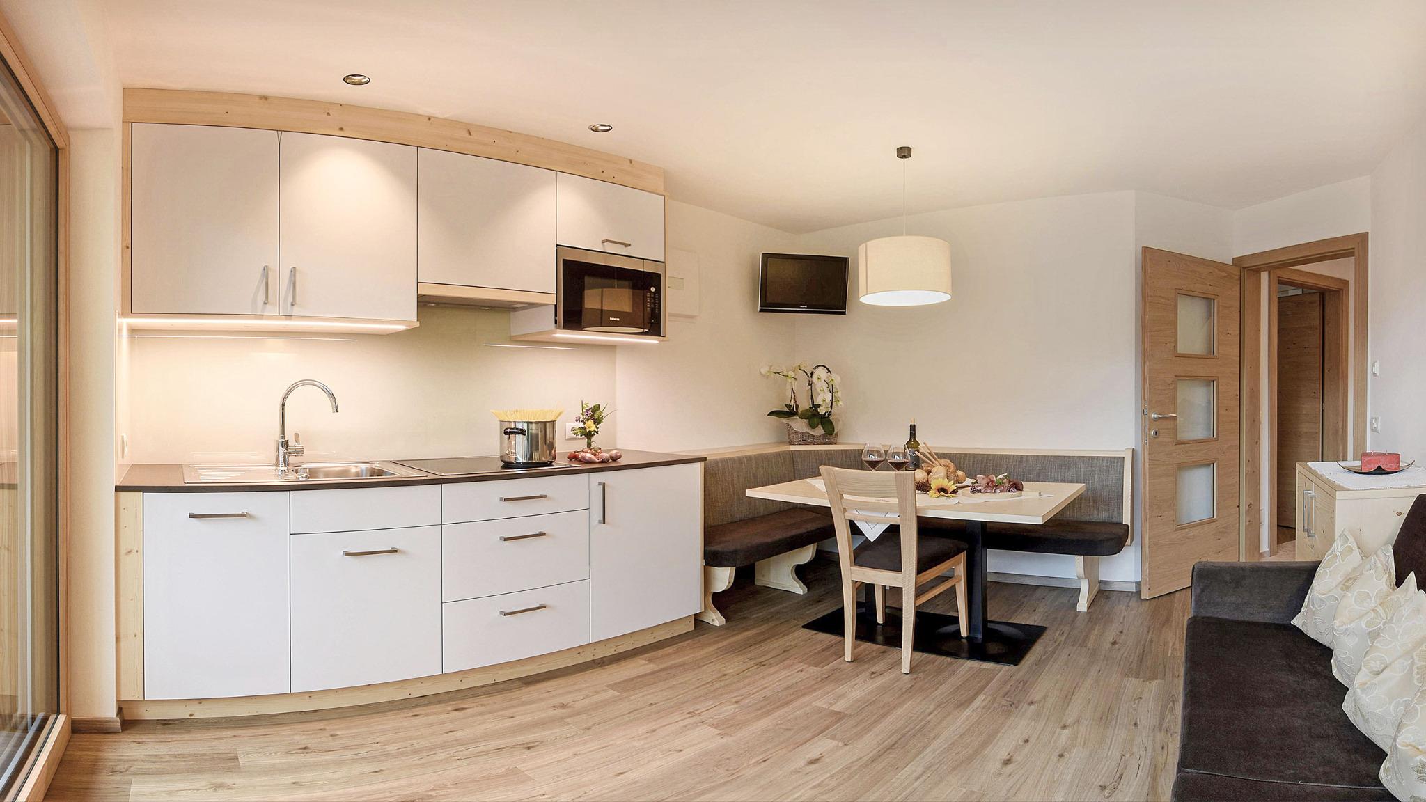 Our four new holiday apartments, comfortably furnished with spruce wood, feature a south balcony and free Wifi – towels and linen are included. Our terrace and our small lawn, however, invite to relax.