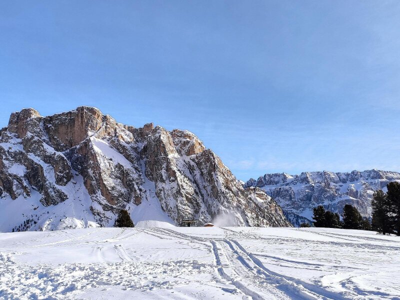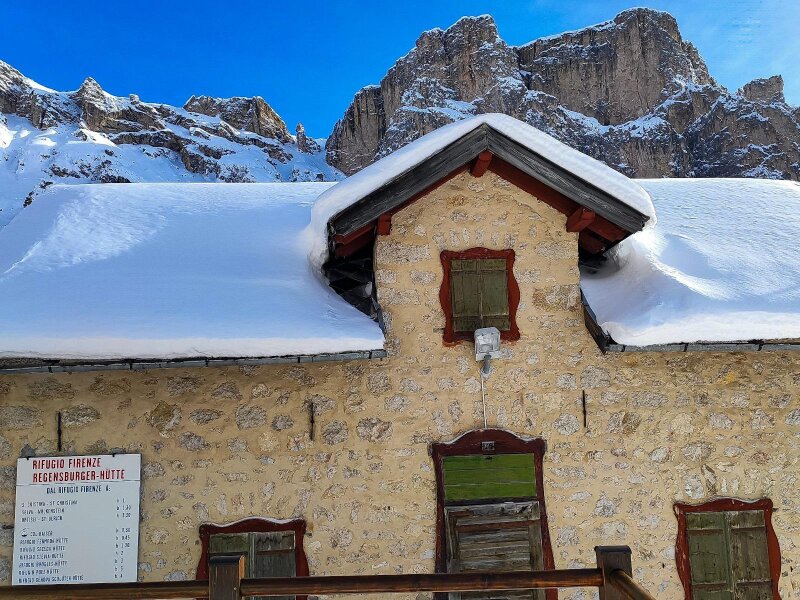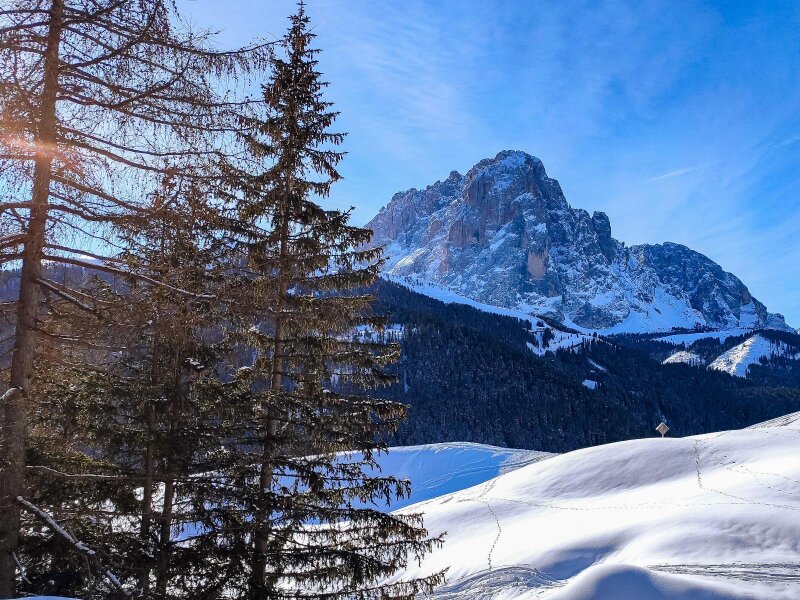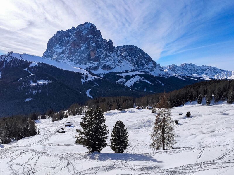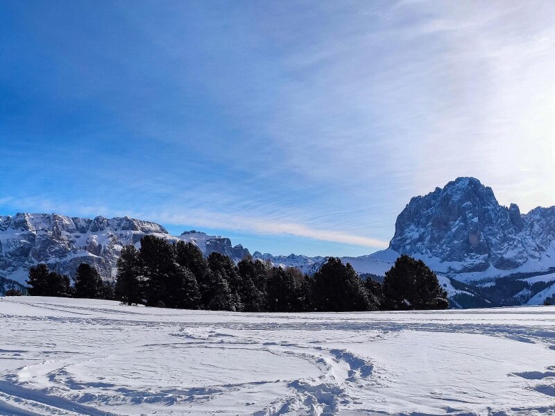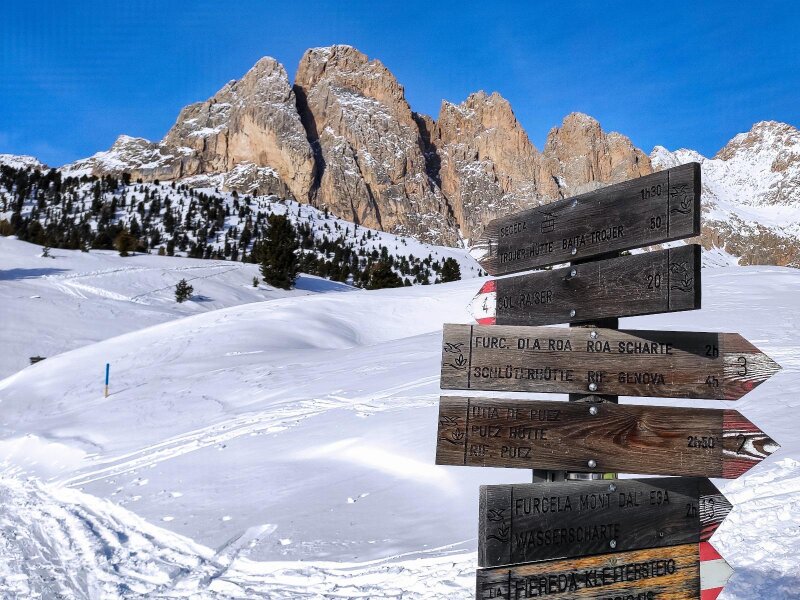 È lo storico anno 2020, in cui facciamo escursioni soprattutto nella nostra regione. Per una passeggiata invernale scegliamo la Val Gardena con i suoi magnifici rifugi e le sue montagne: impianti di risalita e baite sono chiusi in questo giorno di dicembre a causa del Covid, ma il silenzio della natura è per questo ancora più palpabile. I rifugi Juac, Col Raiser e Sangon sono normalmente aperti in inverno, mentre il Rifugio Firenze è aperto solo nella stagione estiva.