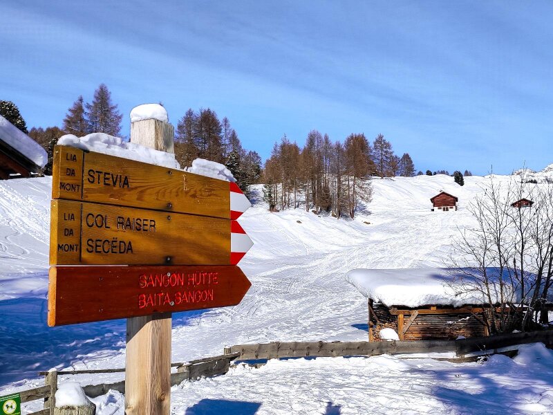 Quasi tutto il percorso è ben battuto, ad eccezione del tratto tra i rifugi Col Raiser e Sangon: lì le ciaspole sarebbero utili. Da Selva Gardena seguiamo le indicazioni per Daunei e parcheggiamo l'auto poco sopra la frazione. Iniziamo la nostra escursione invernale imboccando il primo sentiero a sinistra, con l'indicazione "Seceda - Col Raiser", e camminiamo nel bosco fino al bivio sulla destra, seguendo sempre i cartelli "Seceda", "Col Raiser" e "Stevia", fino a raggiungere il Rifugio Juac.