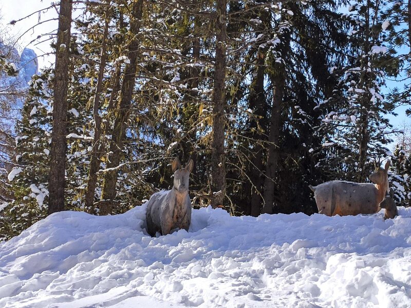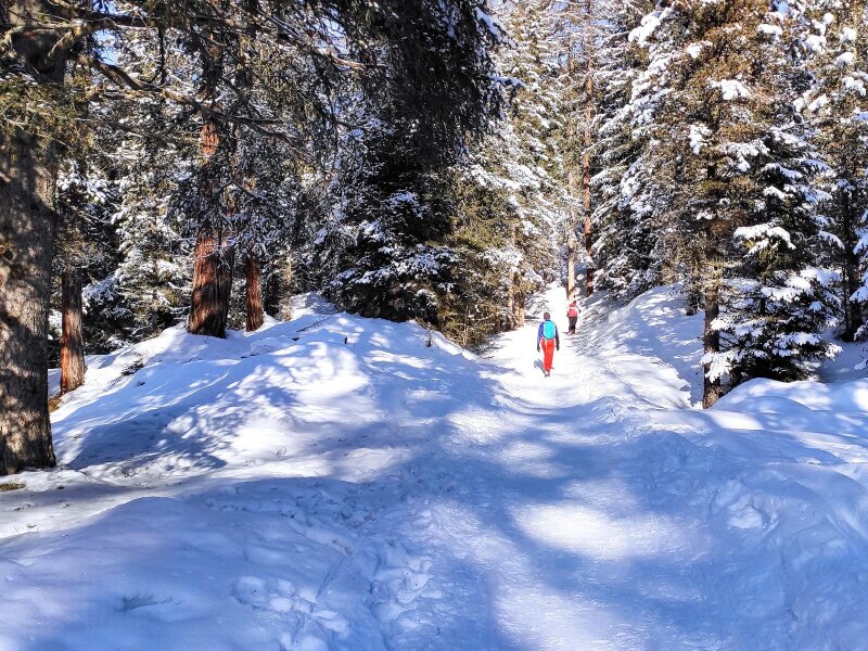 Dalla stazione a monte seguiamo il sentiero a sinistra che scende ripidamente verso la Baita Sangon. Superato un piccolo recinto, si arriva a una pista da sci, che seguiamo per 15-20 minuti fino alla baita. Questo tratto non è battuto e si sprofonda nella neve: le ciaspole sarebbero ideali. Dopo una breve pausa al rifugio, risaliamo fino al Rifugio Juac e da lì ripercorriamo a ritroso il sentiero dell'andata fino al parcheggio. Lo raggiungiamo dopo tre ore di cammino.
