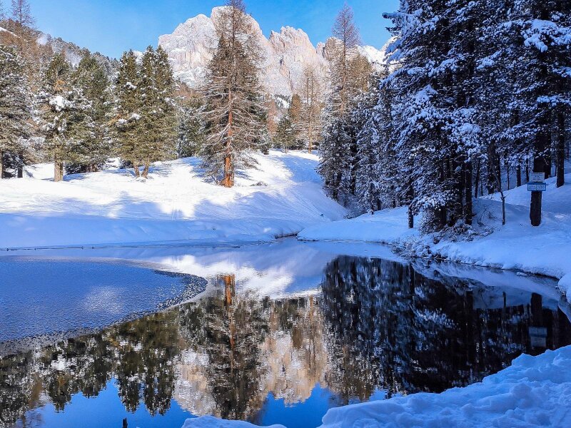 Il bosco si apre a più riprese, regalandoci splendide viste sul Sassolungo e sullo Sciliar innevato. Al Rifugio Juac svoltiamo a destra: il sentiero, prima in leggera salita e poi decisamente più ripido, attraversa il bosco fino a un laghetto semi-ghiacciato in cui si specchiano le montagne. Ci troviamo nel Parco Naturale Puez-Odle. Ora il percorso sale costantemente, finché dopo 40-50 minuti ci troviamo di fronte al Rifugio Firenze (Regensburger Hütte). La vista panoramica è magnifica.